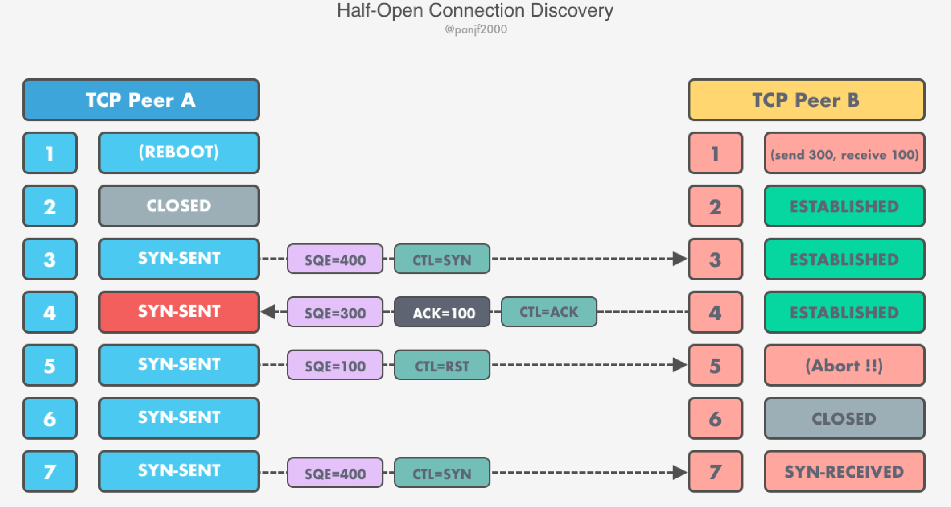 A 端重启之后 A 和 B 之间的连接实际上就已经不能再用来实现可靠通信了。从 A 端的视角来看,这条连接已经不复存在了,然而从 B 端的视角来看,依旧是一切正常,因为 A 端的重启是一个突发的意外,连系统都整个宕机了所以 TCP 来不及通知 B 端终止这个连接,而系统对 TCP 连接也没有相应的持久化机制,因此在重启后也无法找回重启前所有的连接并一一通知远端关闭这些过期的连接,B 端当然就毫不知情了。这时候如果 A 端尝试重连或者 B 端尝试往对端发送数据的话,A 端的 TCP 就会检测到这是一条异常连接,通过发送 RST 报文到对端要求终止连接。